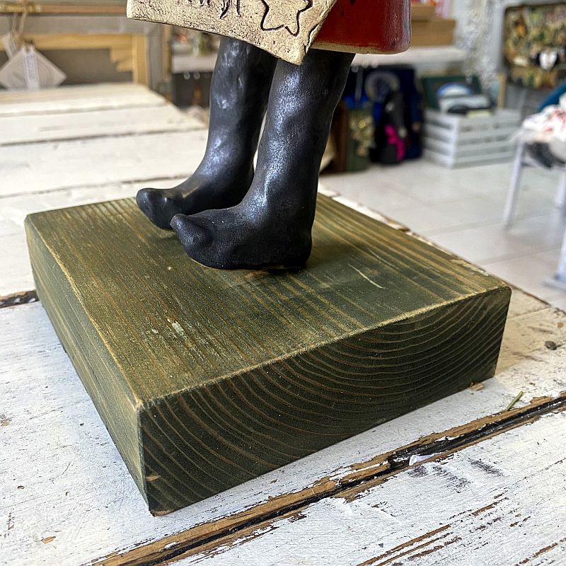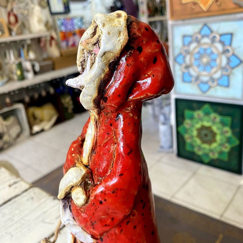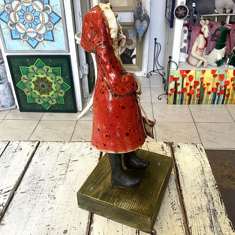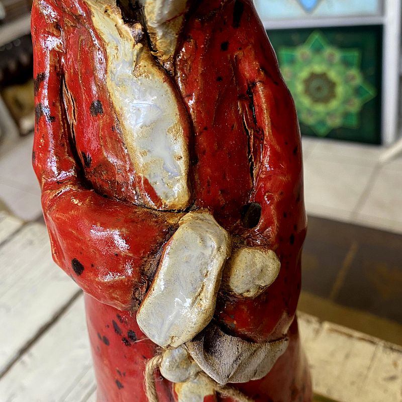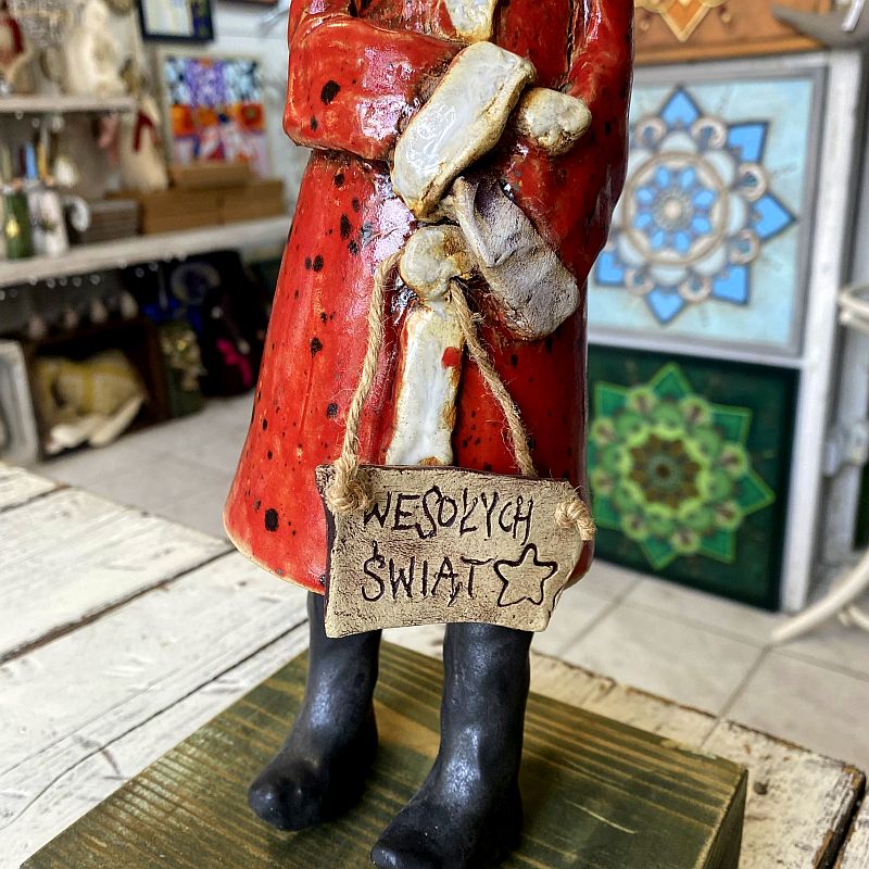 Ręcznie wykonany ceramiczny Mikołaj w czerwonym płaszczu to wyjątkowa dekoracja świąteczna o artystycznym charakterze. Figurka stoi na drewnianej podstawie i zachwyca detalami oraz ciepłym, rustykalnym stylem. Idealna do wnętrz, witryn sklepowych i na prezent.