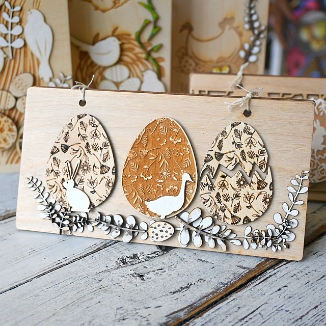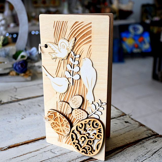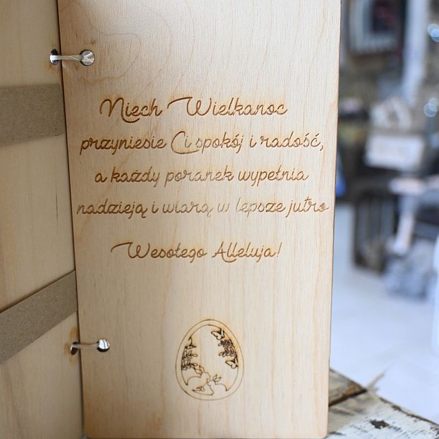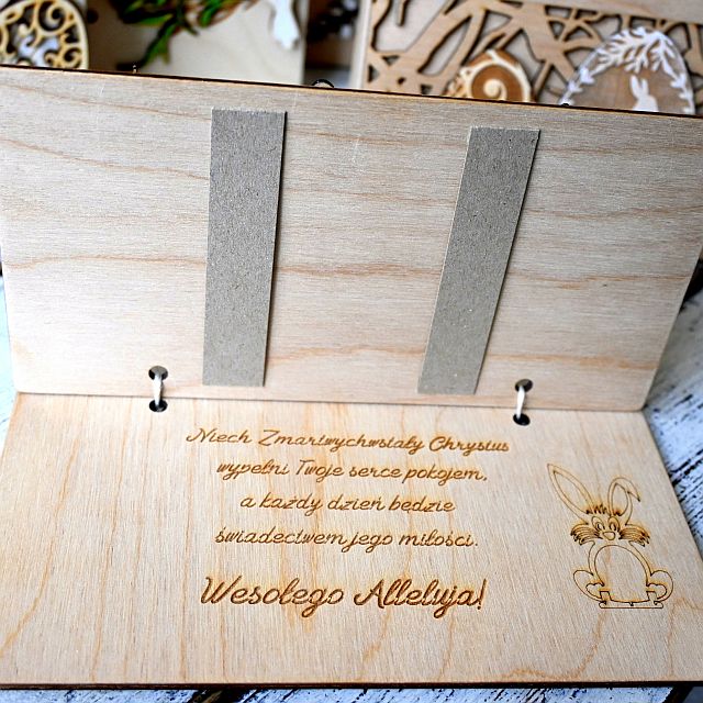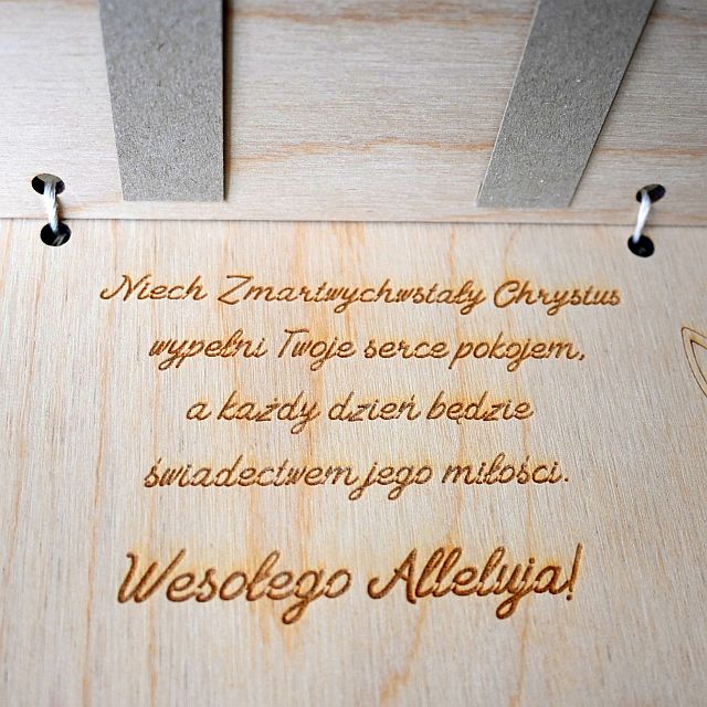 Kartka składa się z dwóch drewnianych paneli połączonych jutowym sznurkiem. Przód zdobią elementy wycinane laserowo oraz dekoracje w postaci ażurowych pisanek, ptaszków i roślinnych wzorów. Wnętrze kartki skrywa piękne, wygrawerowane życzenia – różne w każdym wariancie, co pozwala wybrać treść najlepiej dopasowaną do okazji i odbiorcy. Dodatkowo, w środku znajdują się dwie tekturowe zakładki, do których można wsunąć np. banknot lub kartkę z osobistymi życzeniami.