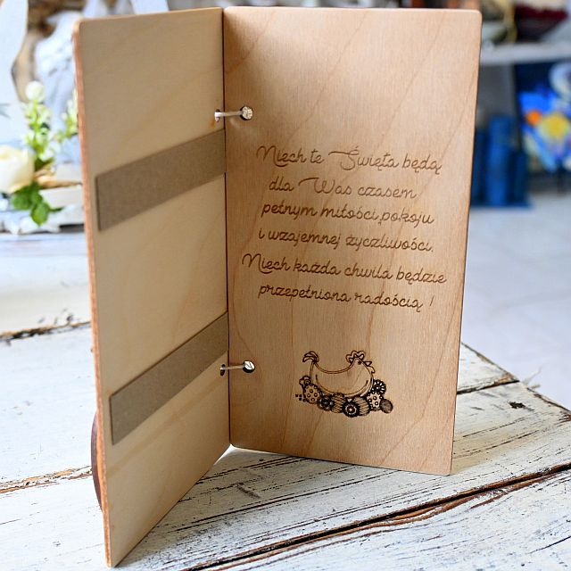 Drewniana kartka idealnie sprawdzi się jako dodatek do prezentu, forma symbolicznego podziękowania lub po prostu ciepły świąteczny gest. Warianty można obejrzeć na zdjęciach, a szczegółowe opisy życzeń znajdują się w opisie każdego z nich. Produkt dostępny w pięciu wersjach graficznych, które różnią się zarówno stylem zdobień, jak i treścią.