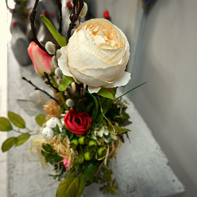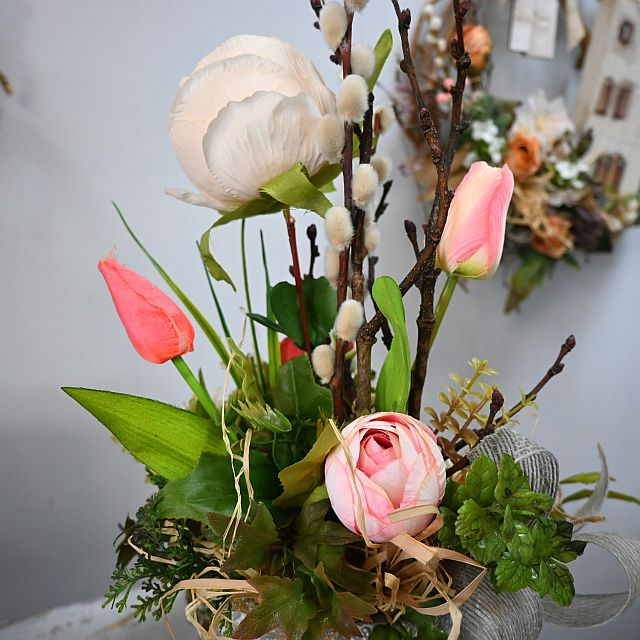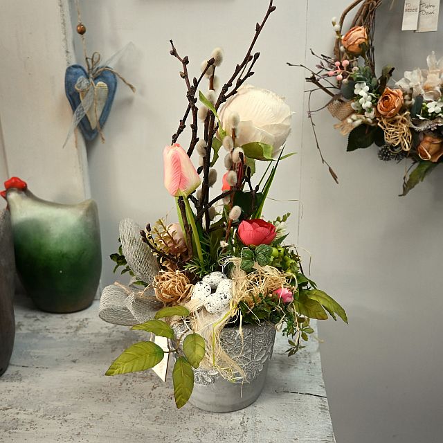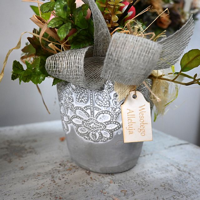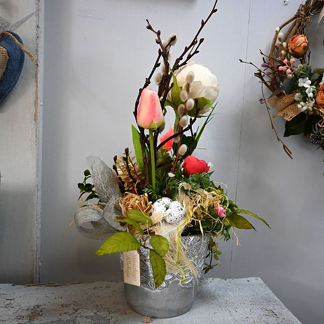 Ta kompozycja wielkanocna w dekoracyjnej doniczce to idealny sposób na wprowadzenie wiosennej świeżości i świątecznego klimatu do Twojego wnętrza. W eleganckiej, szarej donicy z ozdobnym tłoczeniem znajduje się starannie ułożona kompozycja sztucznych kwiatów – delikatne tulipany, żywe gałązki bazi, pastelowe piwonie oraz soczyście zielone liście i drobne dodatki, takie jak gniazdko z jajkami. Całość zdobi szaro-beżowa wstążka jutowa i zawieszka z napisem „Wesołego Alleluja”.