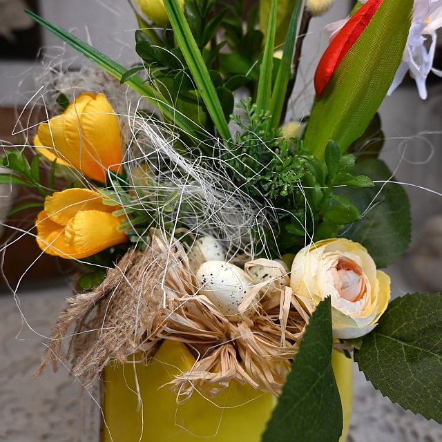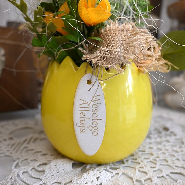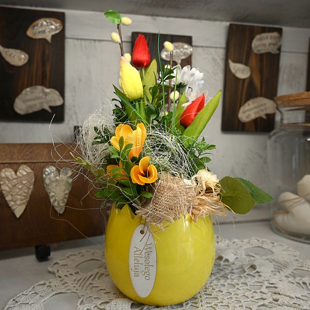 Kompozycja wielkanocna w skorupce jajka to wyjątkowa dekoracja, która łączy w sobie radość świąt, świeżość wiosny i piękno rękodzieła. Osadzona w ceramicznej, żółtej osłonce stylizowanej na skorupkę jajka, przyciąga wzrok już od pierwszego spojrzenia. Zestaw kolorowych, tekstylnych kwiatów – w tym żonkile, stokrotki i tulipany – tworzy żywą, optymistyczną kompozycję, idealną do postawienia na stole, parapecie czy półce. Całość dopełniają drobne, dekoracyjne elementy, takie jak sizal, mech, jaja przepiórcze oraz lniana wstążka z zawieszką „Wesołego Alleluja”.