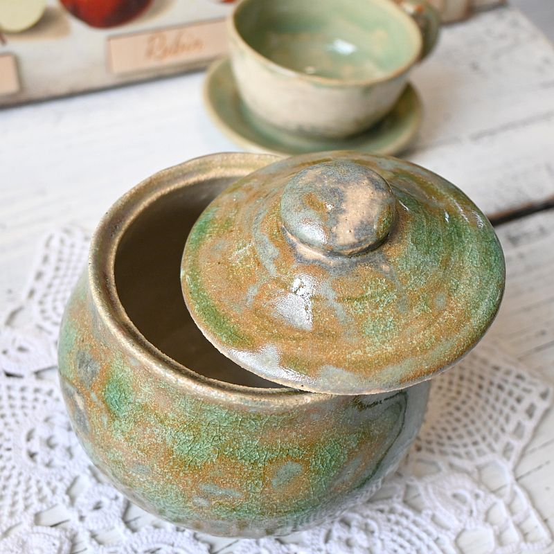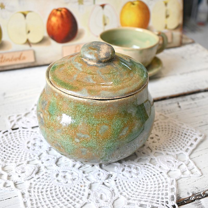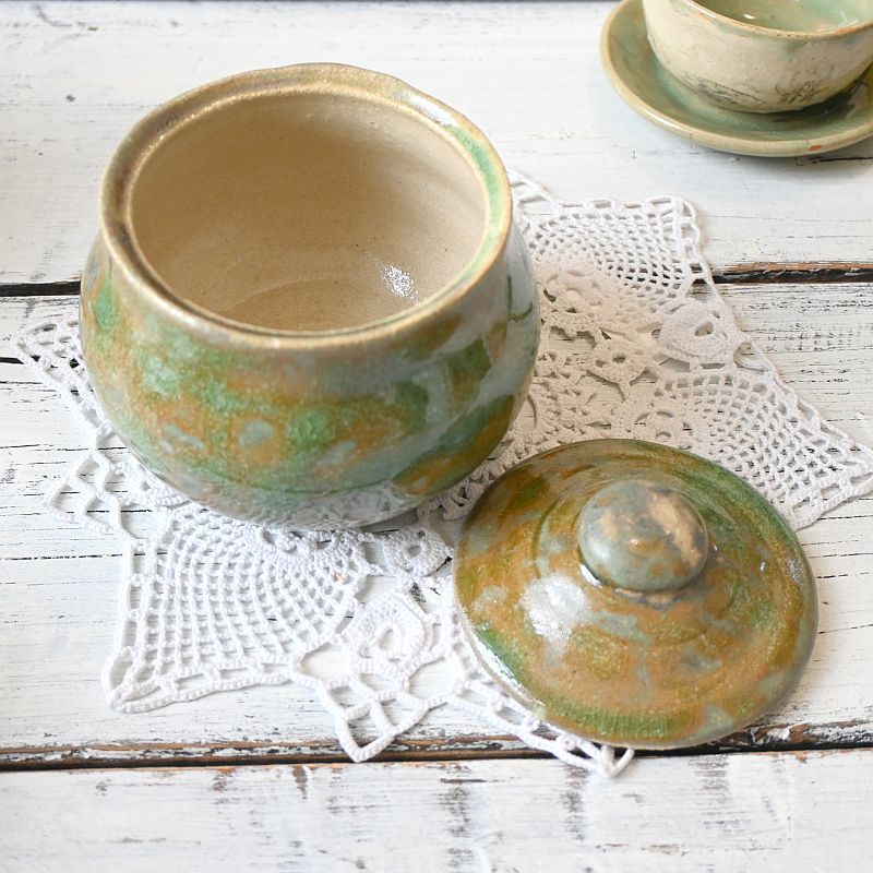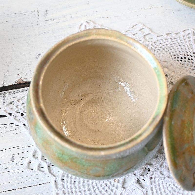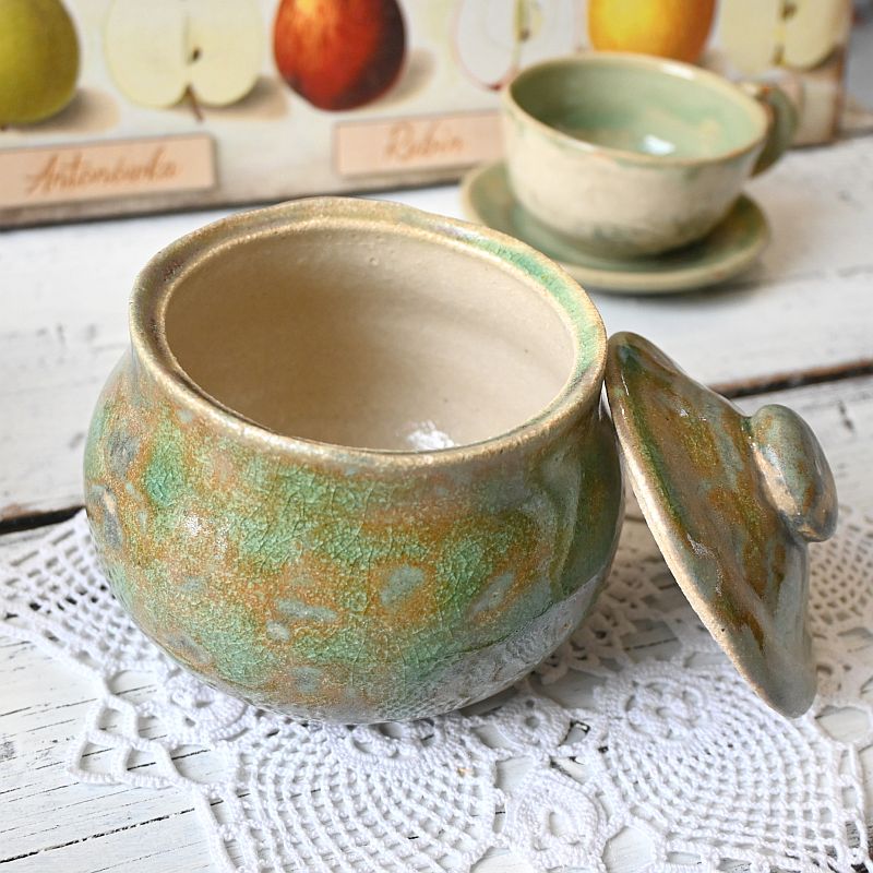 Ceramiczne naczynie z pokrywką, ręcznie wykonane i szkliwione w zielono-brązowych barwach. To praktyczny dodatek do kuchni – świetnie sprawdzi się jako pojemnik na cukier, sól, zioła czy inne przyprawy. Dzięki unikatowemu szkliwieniu pełni nie tylko funkcję użytkową, ale także dekoracyjną, nadając wnętrzu ciepła i naturalnego charakteru.