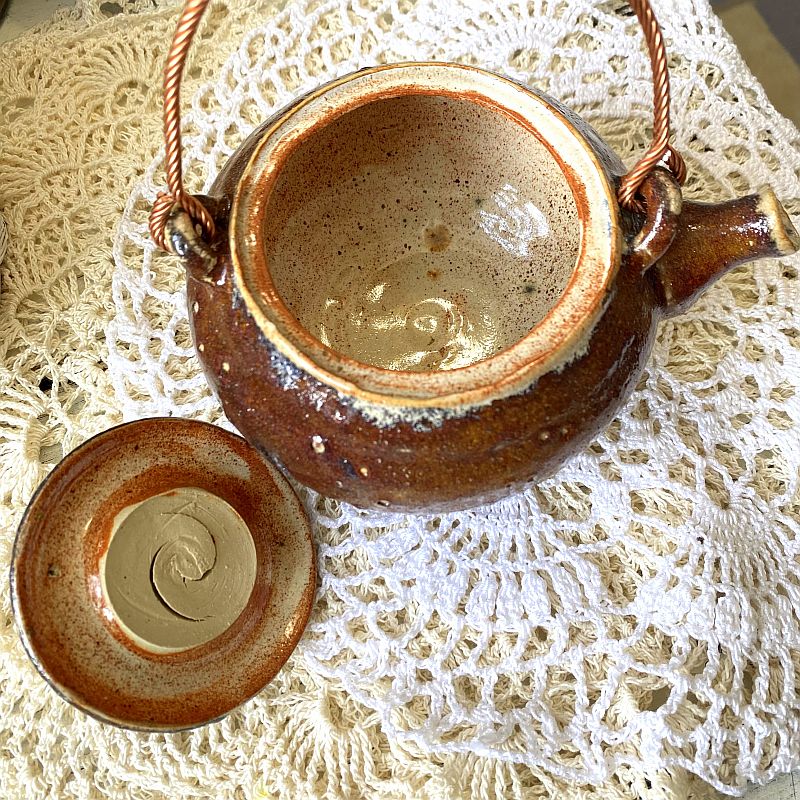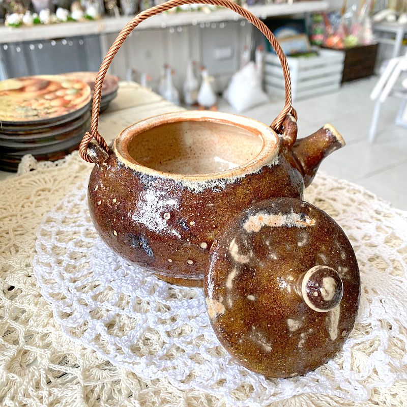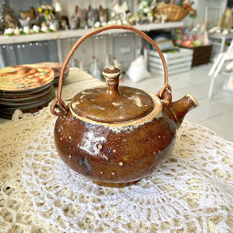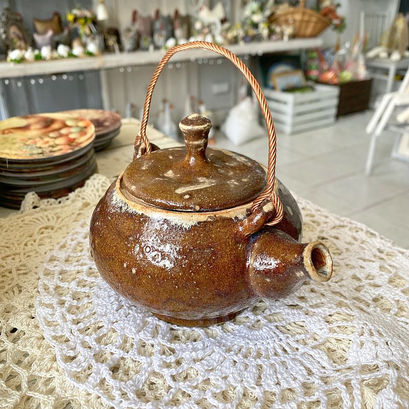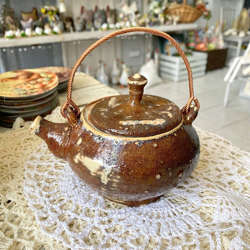 Czajniczek wykonano z ceramiki i pokryto efektownym szkliwem w odcieniach brązu, karmelu oraz beżu. Dodatkowo powierzchnia posiada delikatne przebarwienia i drobne zdobienia, które powstają podczas wypału. Dzięki temu produkt wygląda naturalnie i przyciąga uwagę. Co więcej, dekoracyjna rączka w kolorze miedzi nadaje mu wyjątkowego stylu i podkreśla jego rękodzielniczy charakter.