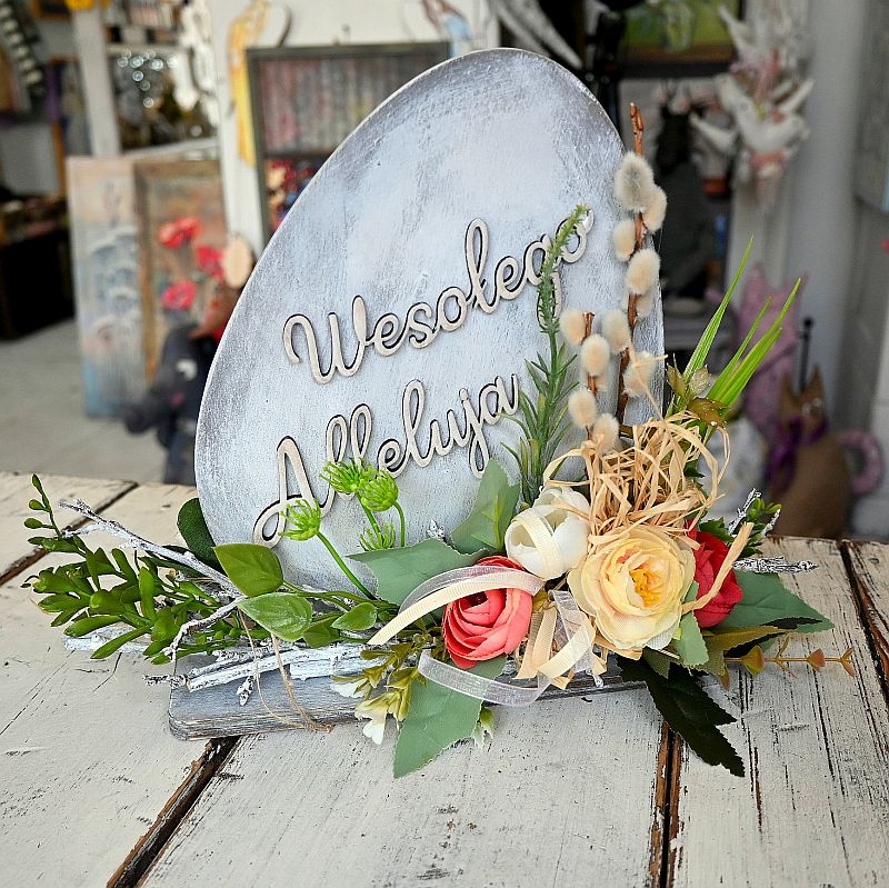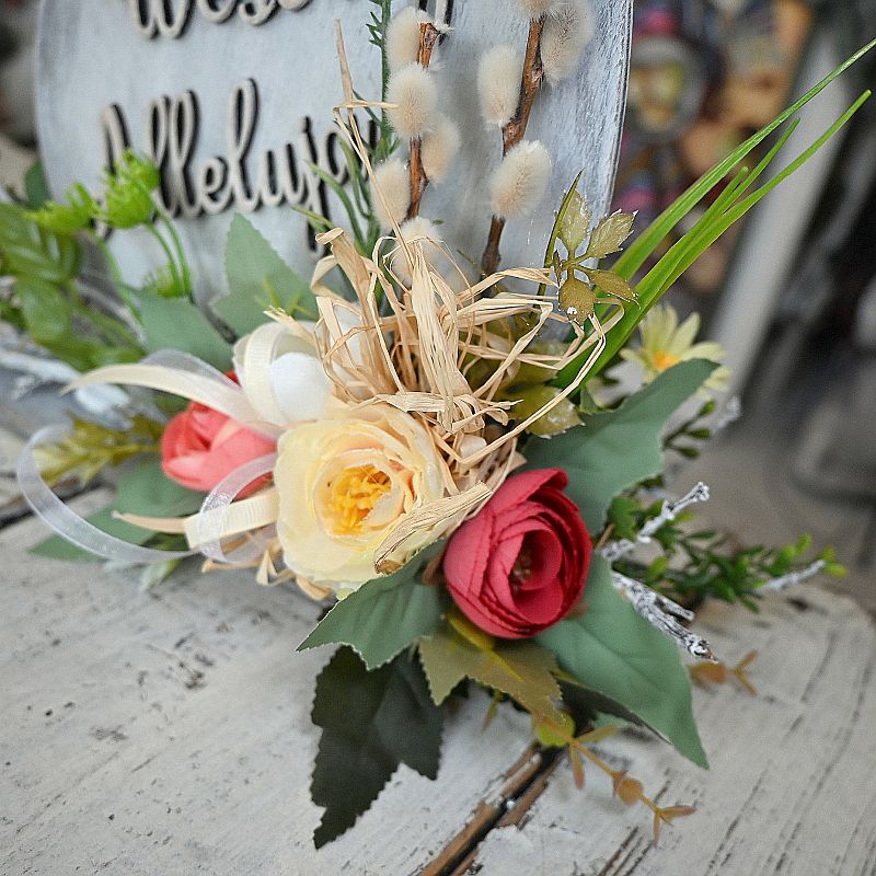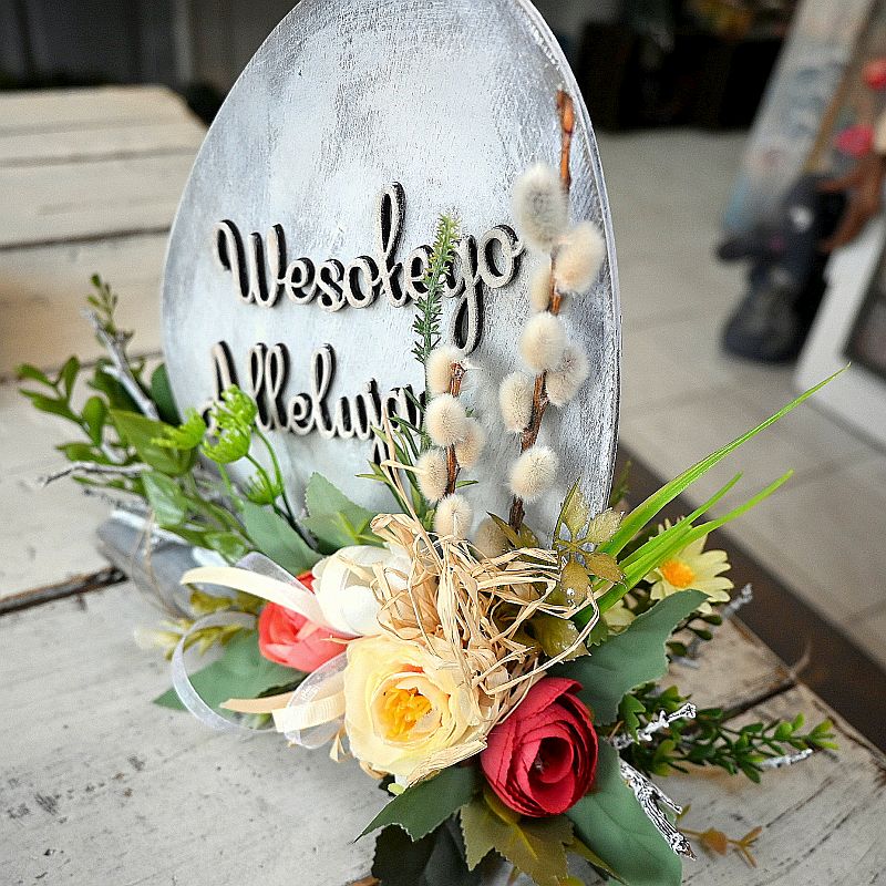 Stroik wielkanocny z napisem „Wesołego Alleluja” to wyjątkowa dekoracja, która wniesie do Twojego domu świąteczny klimat pełen ciepła i radości. Wykonany ręcznie z dbałością o każdy detal, zachwyca eleganckim połączeniem ozdobnego jajka z naturalnymi dodatkami. Stroik tworzą sztuczne kwiaty, zielone gałązki, bazie, sianko oraz subtelne wstążki, które nadają kompozycji lekkości i świeżości. Całość osadzona jest na drewnianej podstawie, dzięki czemu dekoracja jest stabilna i trwała.