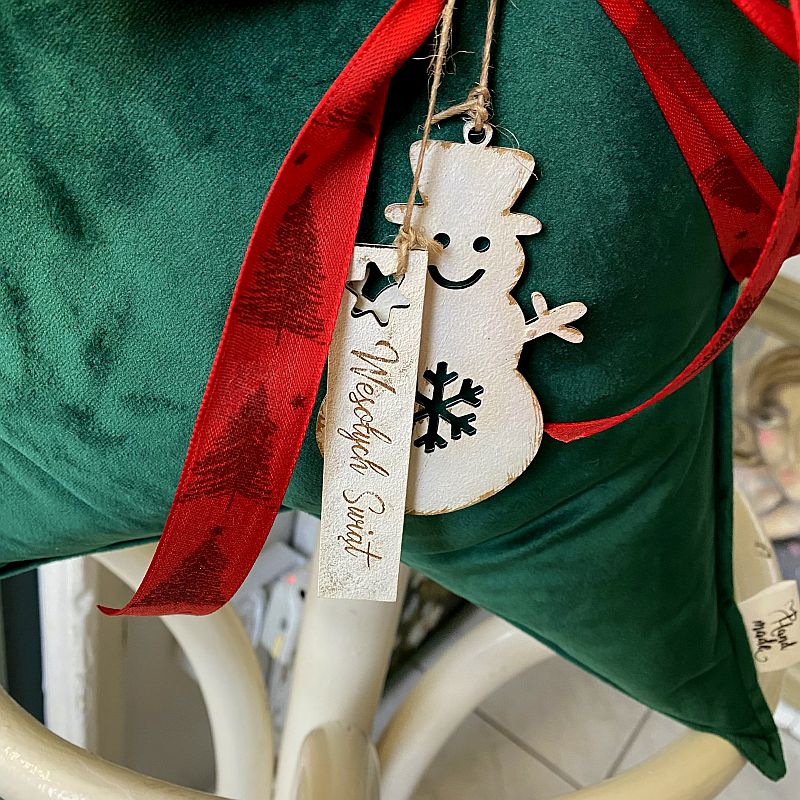 Choinka i gwiazda mają tę samą wielkość, co sprawia, że komplet prezentuje się spójnie i harmonijnie. Choinkę zdobi złota wstążka oraz drewniana zawieszka z napisem „Wesołych Świąt”. Z kolei gwiazda została przewiązana czerwoną wstążką i uzupełniona drewnianą dekoracją w kształcie bałwanka. Te detale dodają całości charakteru i świątecznej radości.